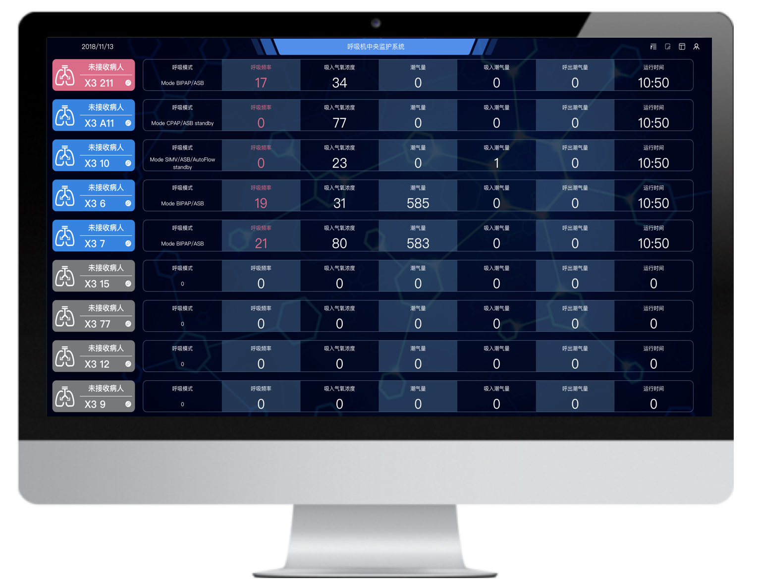 多臺不同品牌的有創(chuàng)呼吸機(jī)聯(lián)網(wǎng),并通過大屏實(shí)時(shí)集中呈現(xiàn)治療預(yù)設(shè)參數(shù)和監(jiān)測參數(shù),實(shí)現(xiàn)多臺集中監(jiān)測、集中管理和數(shù)據(jù)存儲(chǔ)。